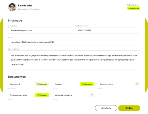 In jouw persoonlijke omgeving voer je jouw gegevens in en upload je gemakkelijk en veilig jouw documenten.